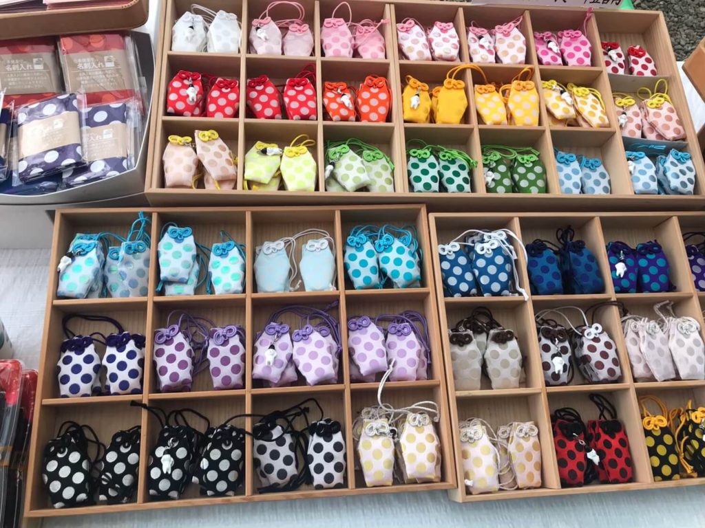 石浦神社の社務所内には色あざやかなお守りが置いてあります。どれも可愛くて選ぶのに迷ってしまいますね。水玉のお守りは「丸く収まる」という円満の意味があります。
