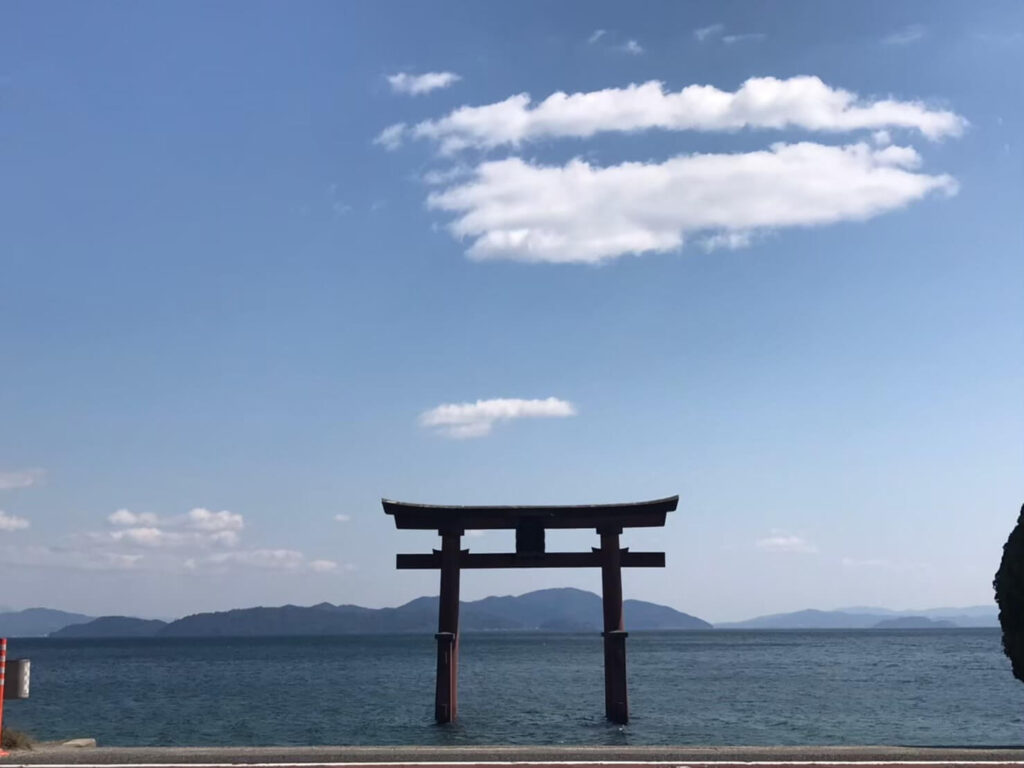 途中、窓の右側に湖にうかぶ大きな鳥居を見ることができます。有名な琵琶湖にうかぶ白鬚神社です。